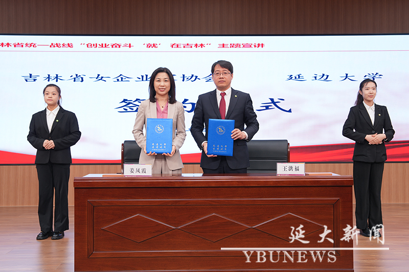 吉林省女企业家协会执行会长、长春建业集团有限公司董事长姜凤霞与副校长王洪福代表双方签订协议