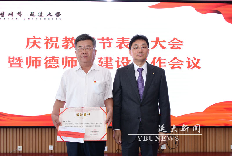 校党委书记梁仁哲为“最美延大人暨黄大年式好老师”朝汉文学院卢雪花等9名老师颁发证书和奖金