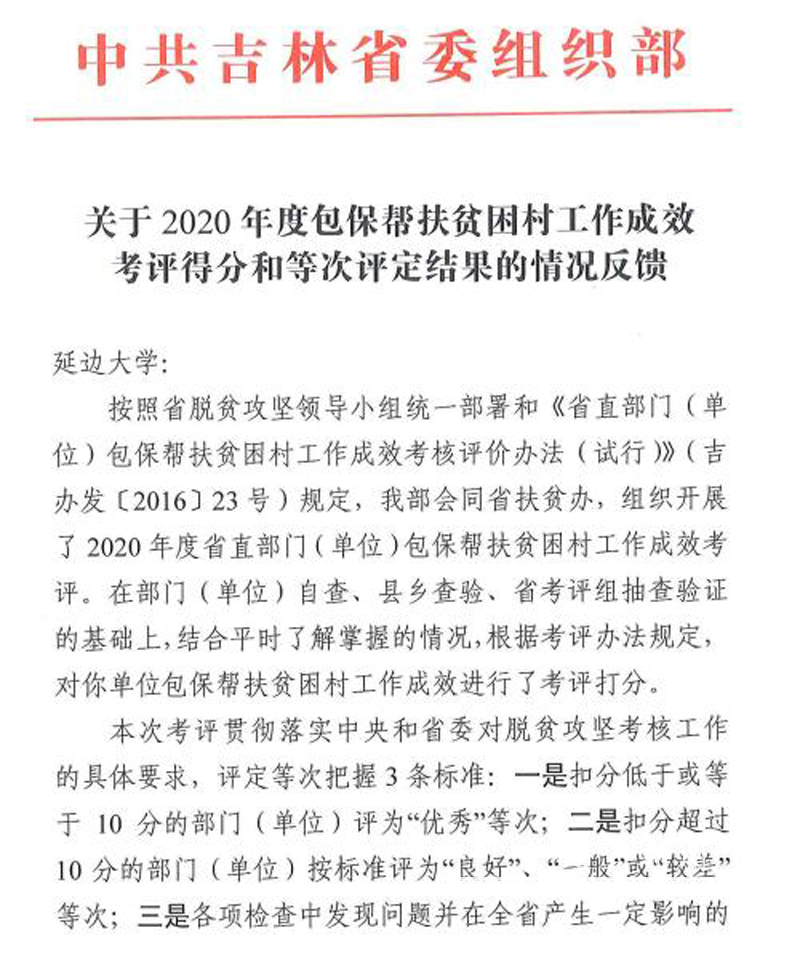近日,按照吉林省脱贫攻坚领导小组统一部署和《省直部门(单位)包保帮扶贫困村工作成效考核评价方法(试行)》(吉办发【2016】23号)规定,吉林省委组织部会同吉林省扶贫办组织开展了2020年度省直部门(单位)包保帮扶贫困村工作成效考评,我校在此次考评中得分为100分,被评为优秀等次。