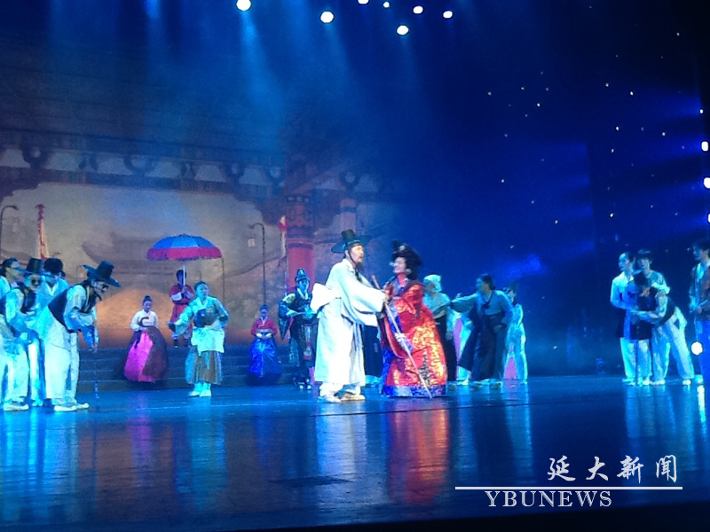 晚上,主办方在世纪剧场举行歌舞晚会,能容纳1700人的剧场座无虚席。70多名演员组成强大的演出阵容,来自我校艺术学院、体育学院的50余名师生应邀参演。晚会在合唱舞蹈《季节的呼唤》中拉开帷幕,手拿彩扇、身着民族长裙的我校学生在宋一、金永哲、林晶、朴洪哲激越的歌声中翩翩起舞,赢得了现场观众热烈的掌声。伽耶琴弹唱《农民之歌》,将优雅的琴声与舒缓的舞蹈和深情的歌唱有机地融合在一起,充分展示了朝鲜民族勤劳善良的民族品格。鼓舞《神仙鼓》鼓声激越,震撼人心。艺术学院、体育学院学生合作《太平舞》独出心裁地将舞蹈与跆拳道结合在一起,尽显盛世风情。我校校友金美儿为晚会带来一曲深情无限的《伟大的爱》,感人至深。校友阿里郎组合一曲《猜不透》,动感十足,尽展青春亮丽风采,点燃全场激情。群舞《生命》以艺术的手法深刻地展示了人类在发展的历程中不屈不挠抗争的人性伟大的尊严。由向开明和黄仙子编舞的群舞《长白瀑布》空灵流转,气势磅礴,舞蹈采用拟人手法,淋漓尽致地展示了长白美景和生活在长白山脚下的朝鲜族乐观向上的精神风貌、丰富细腻的内心世界。校友卞英花一曲高亢激昂的《梅花打令》震撼全场。校友林晶为晚会激情奉上《森林大海》。校友金永哲的一曲《图们江之歌》,将观众带回到18世纪朝鲜民族迫于生存,背井离乡、跋山涉水的那段悲惨生活,今昔对比,使大家更加珍惜现今的美好生活。音乐剧《父女相逢》取材于朝鲜古典小说《沈清传》,艺术地再现了朝鲜孝女沈清感天动地的孝行。晚会在大合唱《故乡之春》中圆满落下帷幕。