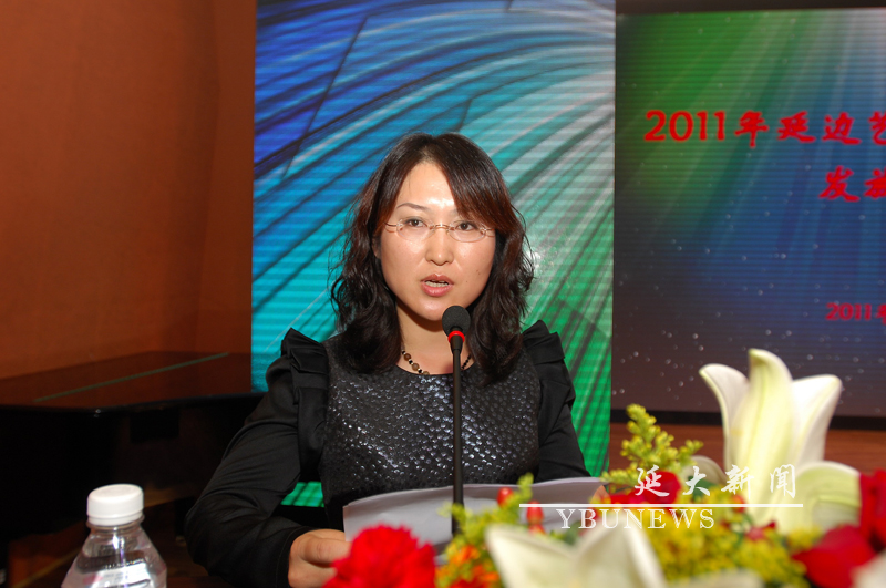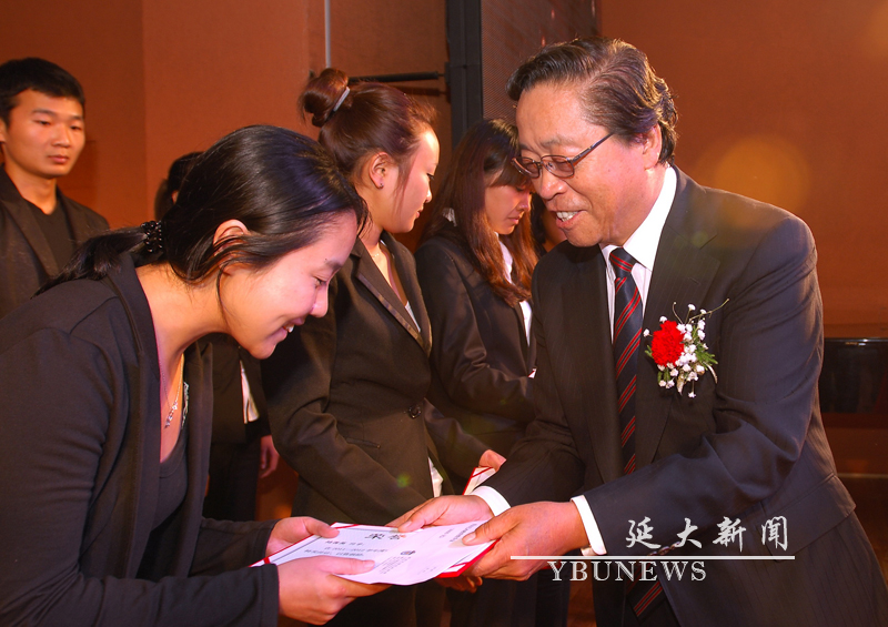 艺术学院学工办主任郑仁顺宣读了《关于授予王丽红等20名学生奖学金的决定》。李德洙向获奖学生颁发证书和奖学金,获奖学生代表王丽红在会上发言。