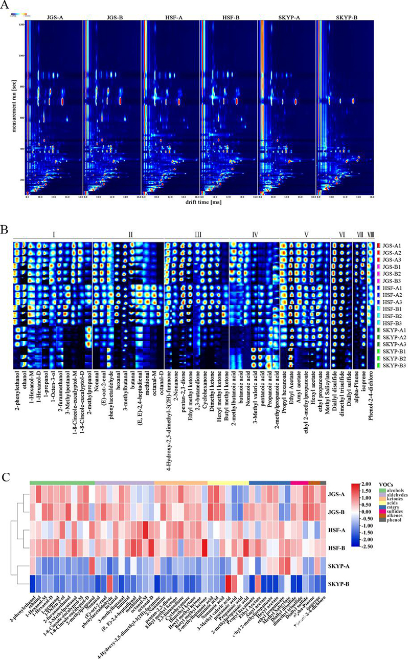 本研究采用顶空-气相色谱-离子迁移谱法(HS-GC-IMS)、高通量测序和Spearman相关性分析,研究3种泡菜在4℃贮存一周期间的风味物质及菌群的变化特征。结果表明,从3种泡菜中共鉴定出50种挥发性有机化合物,在贮存过程中,大部分醇类、醛酮类和酯类物质减少,而酸类物质增加,硫化物、烯类、酚类物质较为平均。从3种泡菜中共鉴定出厚壁菌门(Firmicutes)、蓝藻菌门(Cyanobacteria)和变形菌门(Proteobacteria)3个优势菌门以及魏斯氏菌属(Weissella)、链霉菌属(Streptophyta)、明串珠菌属(Leuconostoc)、Bacillariophyta、乳杆菌属(Lactobacillus)5个优势菌属。Spearman相关系数表明Leuconostoc、Lactobacillus和Weissella是泡菜中风味形成的主要菌属,而Bacillariophyta和Streptophyta是泡菜贮存过程中风味形成的主要菌属。此研究结果有助于更好地了解微生物在泡菜贮存过程中风味形成的作用。