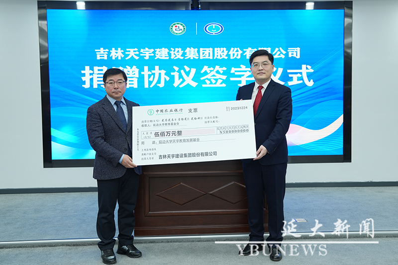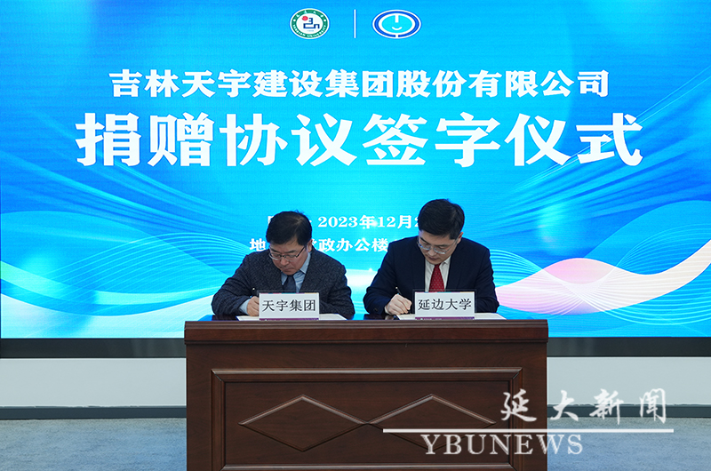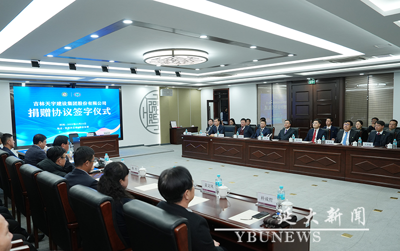 (通讯员 张宇锋) 12月24日下午,我校在党政办公楼4楼会议室举行吉林天宇建设集团股份有限公司(以下简称“天宇建设集团”)捐赠协议签字仪式。天宇建设集团党委书记田奎相、董事长洪松范,延边朝鲜族企业家协会会长韩杰;校党委书记冯涛,校党委副书记、校长蔡红星及天宇建设集团相关领导、学校党委常委班子部分成员出席仪式。仪式由副校长张学武主持。