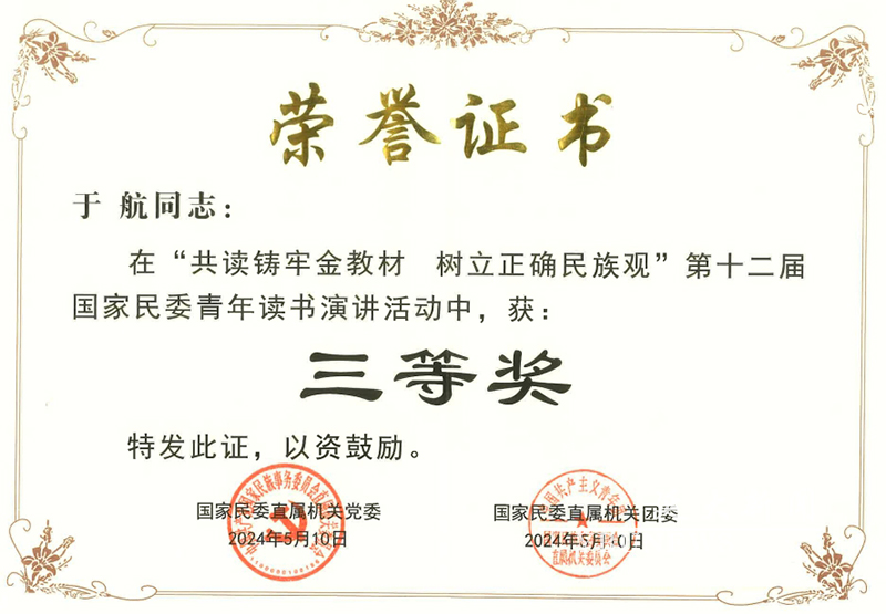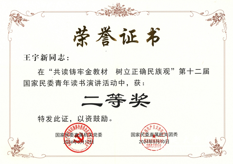 (校团委供稿)近日,“共读铸牢金教材 树立正确民族观”第十二届国家民委青年读书演讲活动选拔赛在西南民族大学举行。比赛共有来自国家民委各机关部门、直属单位和13所民族(地区)高校的56名青年选手参加。由我校团委推荐参赛的青年教师王宇新、于航喜获佳绩。