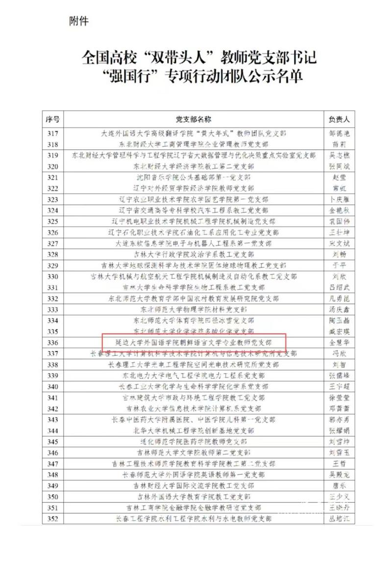 (通讯员何鑫)日前,根据《教育部办公厅关于开展高校“双带头人”教师党支部书记“强国行”专项行动的通知》要求,经各高校党委审核把关、省级党委教育工作部门择优推荐、专项行动办公室备案审核,我校外国语学院朝鲜语言文学专业教师党支部入选全国高校“双带头人”教师党支部书记“强国行”专项行动团队名单。