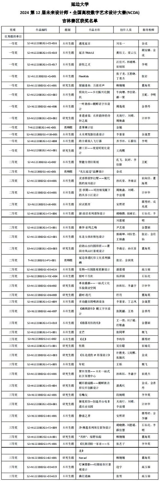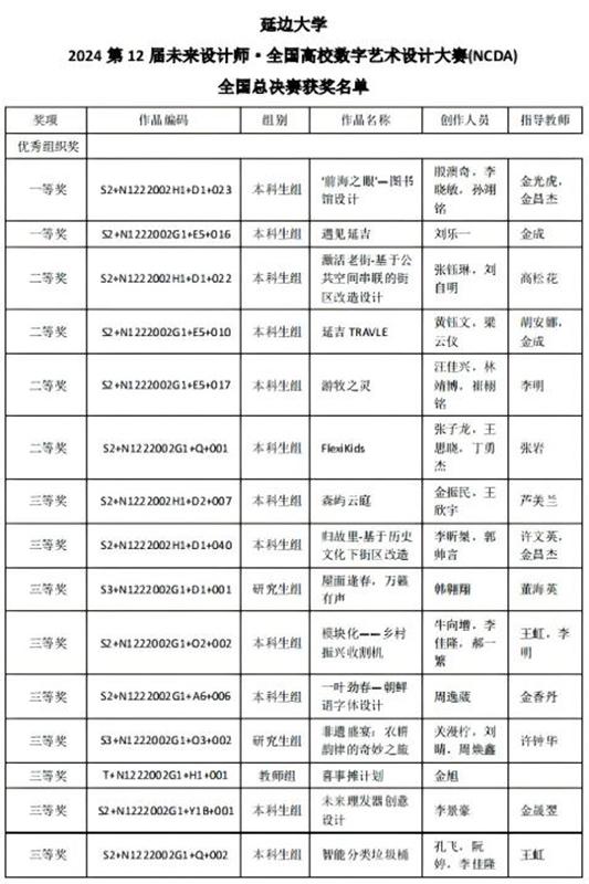 (教务处供稿)日前,2024年(第12届)未来设计师·全国高校数字艺术设计大赛(NCDA)获奖结果揭晓。我校师生在本次比赛中荣获国家级一等奖2项、二等奖4项、三等奖9项,省级一等奖12项、二等奖12项、三等奖21项,学校荣获吉林省优秀组织奖和全国优秀组织奖两项殊荣。