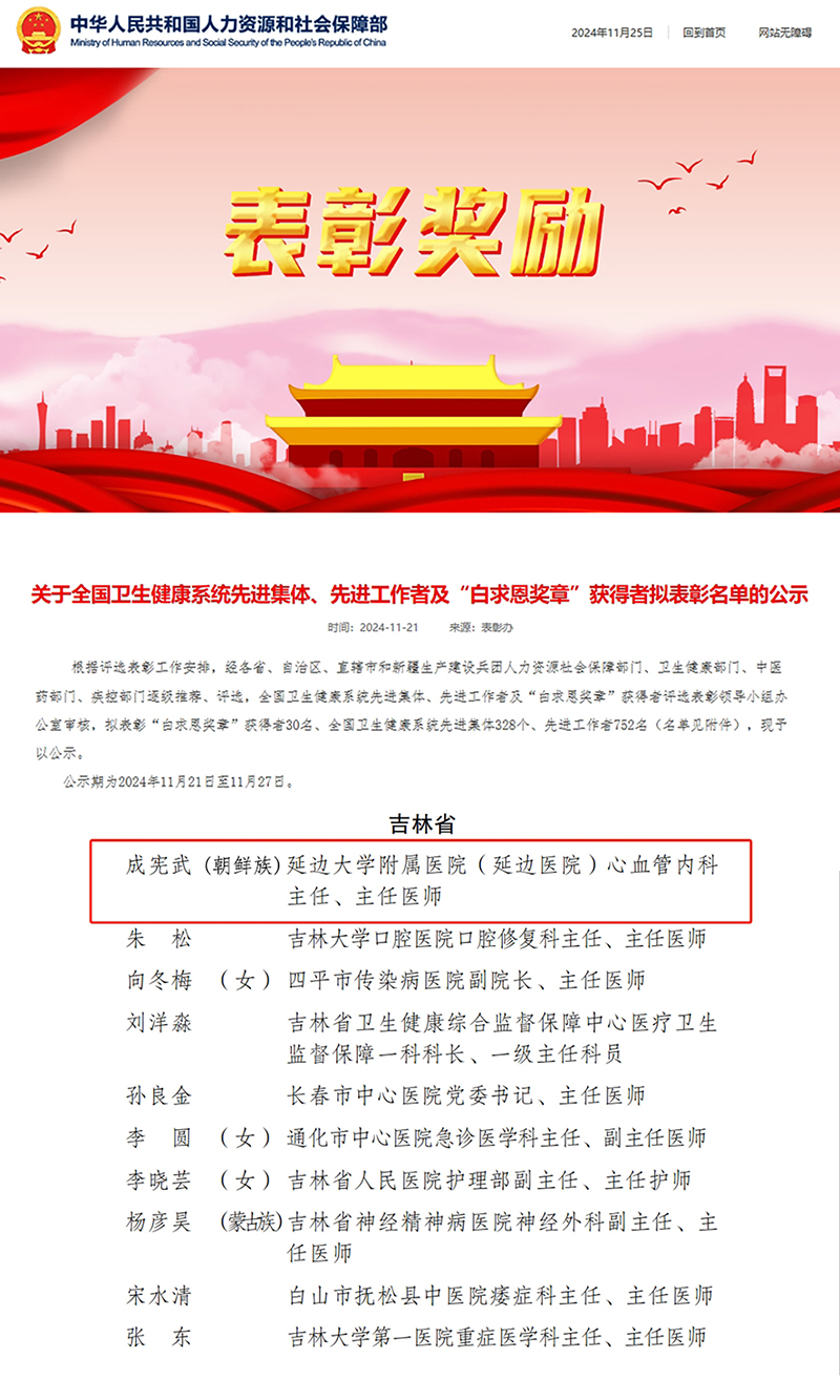 (通讯员张宇锋)日前,人力资源和社会保障部发布公示,对30名“白求恩奖章”获得者、328个全国卫生健康系统先进集体、752名全国卫生健康系统先进工作者进行表彰。我校成宪武教授荣获“全国卫生健康系统先进工作者”称号。