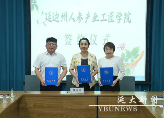 农学院副院长朴政玉、药学院副院长姜国哲和张颖共同签署合作协议;张玉红、李海玉为延边州人参产业工匠学院揭牌。朴政玉对延边州人参产业工匠学院建设背景与定位进行了汇报。与会人员集体考察了延边州人参产业工匠学院实训基地。