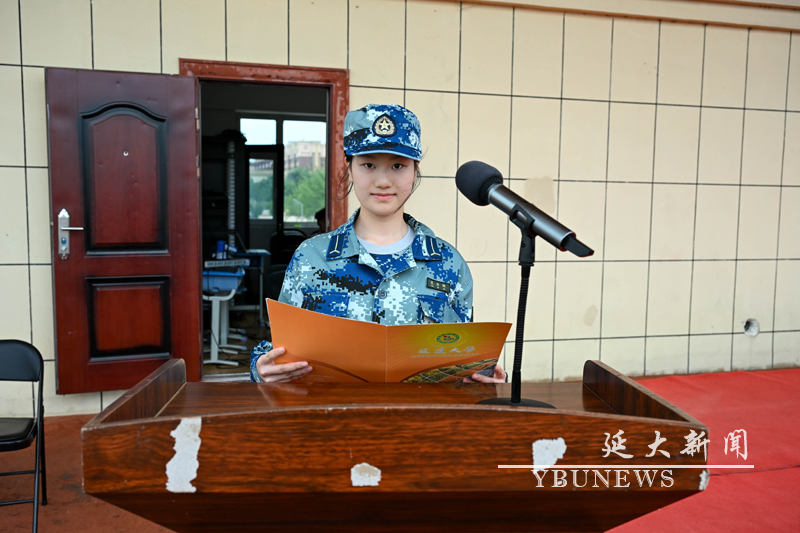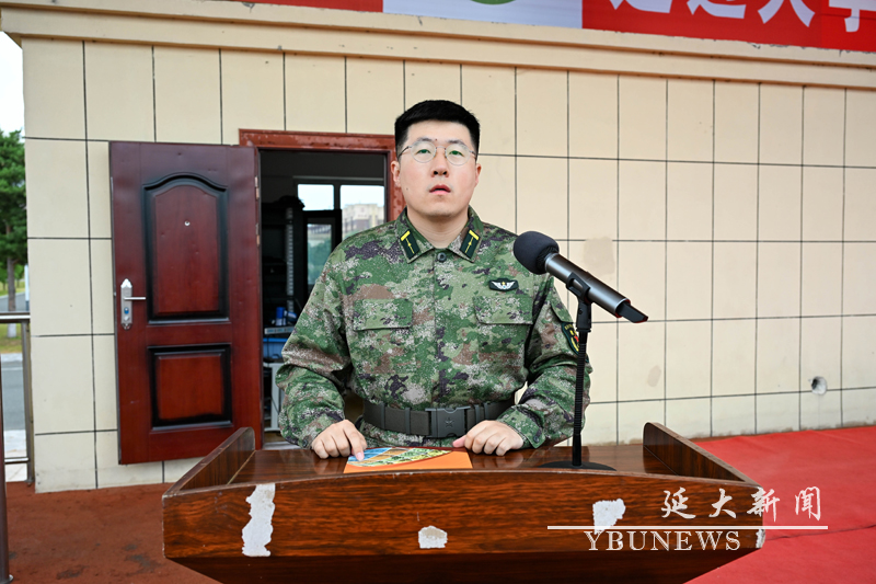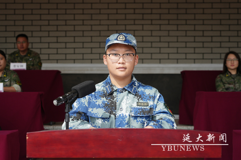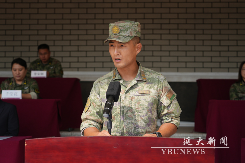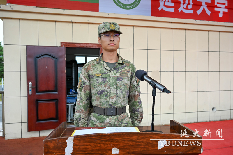 工学院辅导员蒋君豪、地理与海洋科学学院辅导员雷欢代表全体指导员发言;驻延吉某部队毛歆志、驻珲春某部队许天浩代表全体军训教官发言;文学院2025级新生刘昊轩、经济管理学院2025级新生范泽锦代表全体参训学生发言。