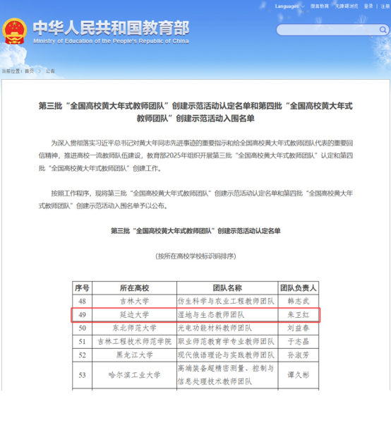 (通讯员高子愉)近日,教育部公布了第三批“全国高校黄大年式教师团队”创建示范活动认定名单,我校“湿地与生态教师团队”入选。